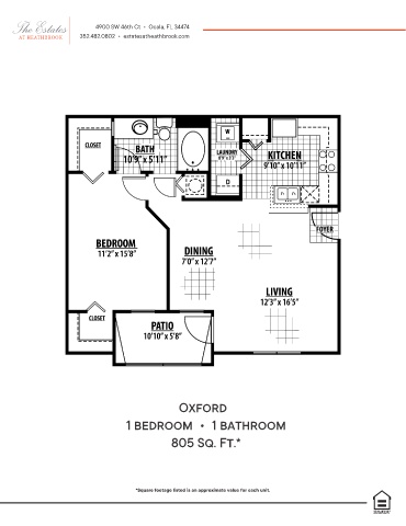 4900 SW 46th Ct • Ocala, FL 34474 352.482.0802 • estatesatheathbrook.com Oxford 1 bedroom • 1 bathroom 805 Sq. Ft.* *Square footage listed is an approximate value for each unit.
