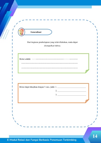 Generalisasi Dari kegiatan pembelajaran yang telah dilakukan, maka dapat disimpulkan bahwa: Relasi adalah Relasi dapat disajikan dengan 3 cara, yaitu: 1. ____________________________ 2. ____________________________ 3. ____________________________ 14