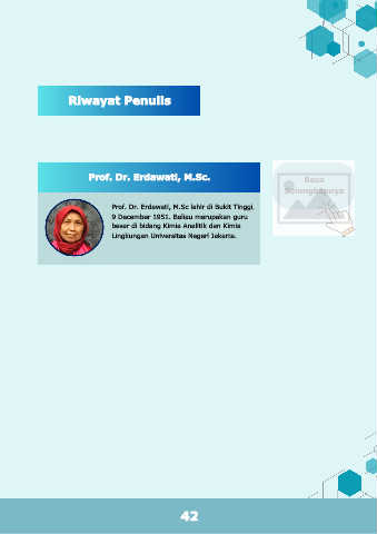 Riwayat Penulis Prof. Dr. Erdawati, M.Sc. Baca Selengkapnya Prof. Dr. Erdawati, M.Sc lahir di Bukit Tinggi, 9 December 1951. Beliau merupakan guru besar di bidang Kimia Analitik dan Kimia Lingkungan Universitas Negeri Jakarta. 42