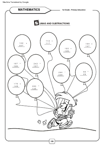 Machine Translated by Google MATHEMATICS 1st Grade - Primary Education UMAS AND SUBTRACTIONS 1 4 2 + 1 3 2 + 1 1 7 1 6 4 + 2 2 7 1 2 7 1 8 3 + 1 3 5 1 9 7 – 2 4 3 – 1 3 9 1 2 7 2 9 0 – 5 6 – 2 9 2 3 5 1 7 6 + 1 4 9 3 9 3 – 1 2 5 136