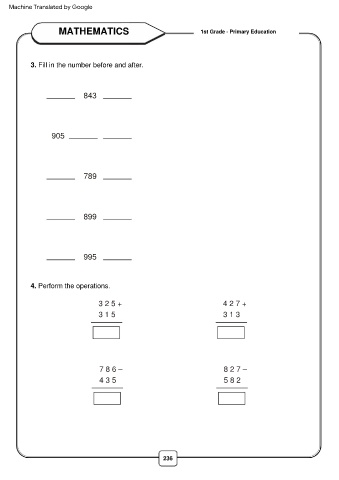 Machine Translated by Google MATHEMATICS 1st Grade - Primary Education 3. Fill in the number before and after. 843 905 789 899 995 4. Perform the operations. 3 2 5 + 4 2 7 + 3 1 5 3 1 3 7 8 6 – 8 2 7 – 4 3 5 5 8 2 236