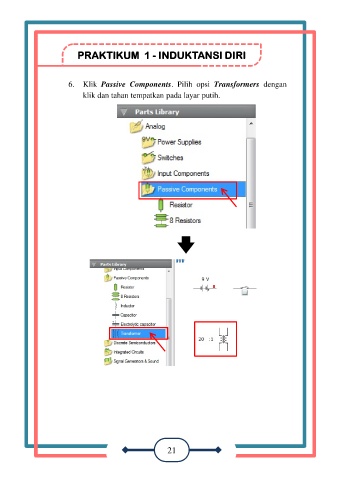 PRAKTIKUM 1 - INDUKTANSI DIRI 6. Klik Passive Components. Pilih opsi Transformers dengan klik dan tahan tempatkan pada layar putih. 21