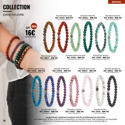 de 15 à 18 cm. Bracelets pierres naturelles 6mm et perle en acier sur élastique Ø6 cm.