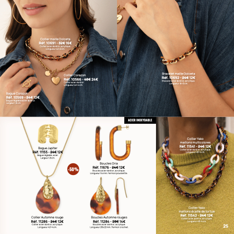 Collier acier doré or, acrylique.
