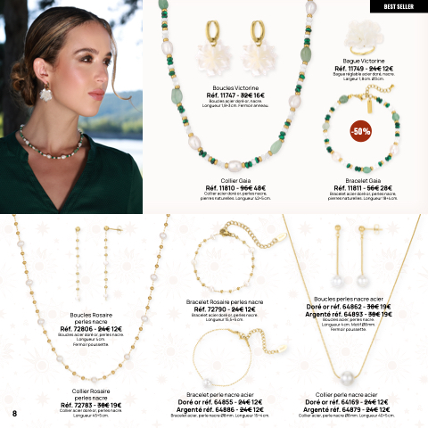 Collier acier, perle nacre Ø8 mm. Longueur 40+5 cm.