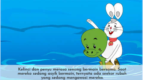 Kelinci dan penyu merasa senang bermain bersama. Saat mereka sedang asyik bermain, ternyata ada seekor rubah yang sedang mengawasi mereka.
