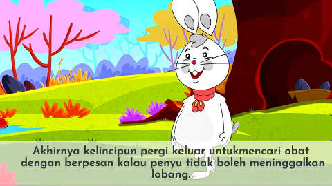 Akhirnya kelincipun pergi keluar untukmencari obat dengan berpesan kalau penyu tidak boleh meninggalkan lobang.