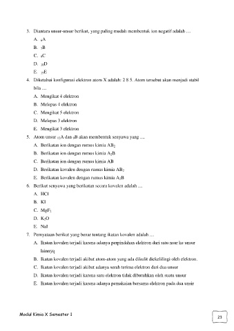 3. Diantara unsur-unsur berikut, yang paling mudah membentuk ion negatif adalah ....