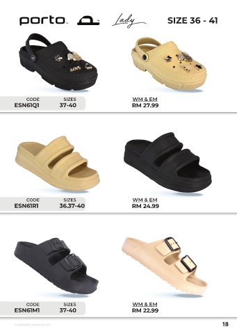 SIZE 36 - 41 CODE SIZES WM & EM ESN61Q1 37-40 RM 27.99 CODE SIZES WM & EM ESN61R1 36.37-40 RM 24.99 CODE SIZES WM & EM ESN61M1 37-40 RM 22.99 18 Copyright@Resta Enterprise Sdn bhd