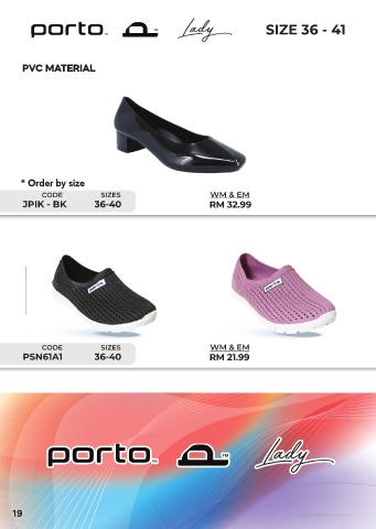 SIZE 36 - 41 PVC MATERIAL * Order by size CODE SIZES WM & EM JPIK - BK 36-40 RM 32.99 CODE SIZES WM & EM PSN61A1 36-40 RM 21.99 19 Copyright@Resta Enterprise Sdn bhd