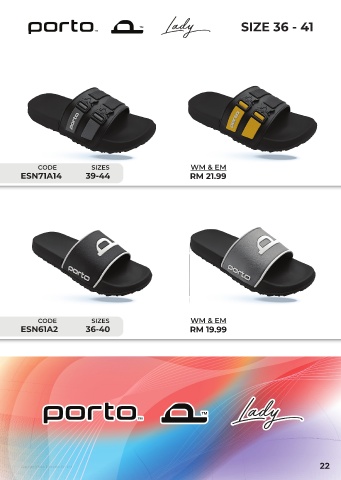 SIZE 36 - 41 CODE SIZES WM & EM ESN71A14 39-44 RM 21.99 CODE SIZES WM & EM ESN61A2 36-40 RM 19.99 22 Copyright@Resta Enterprise Sdn bhd