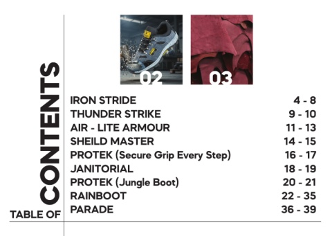 CONTENTS 02 03 IRON STRIDE 4 - 8 THUNDER STRIKE 9 - 10 AIR - LITE ARMOUR 11 - 13 SHEILD MASTER 14 - 15 PROTEK (Secure Grip Every Step) 16 - 17 JANITORIAL 18 - 19 PROTEK (Jungle Boot) 20 - 21 RAINBOOT 22 - 35 TABLE OF PARADE 36 - 39