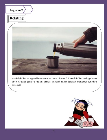 Kegiatan 2 Relating Apakah kalian sering melihat termos air panas dirumah? Apakah kalian tau bagaimana air bisa tahan panas di dalam termos? Bisakah kalian jelaskan mengenai peristiwa tersebut? 14