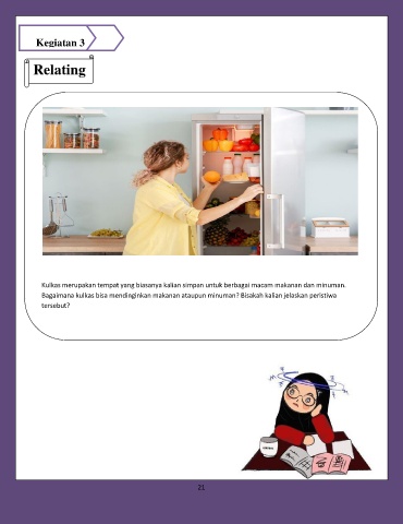 Kegiatan 3 Relating Kulkas merupakan tempat yang biasanya kalian simpan untuk berbagai macam makanan dan minuman. Bagaimana kulkas bisa mendinginkan makanan ataupun minuman? Bisakah kalian jelaskan peristiwa tersebut? 21