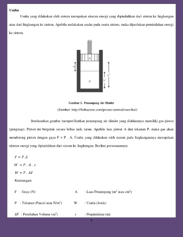mendorong piston dengan gaya F = P . A. Usaha yang dilakukan oleh sistem pada lingkungannya merupakan
