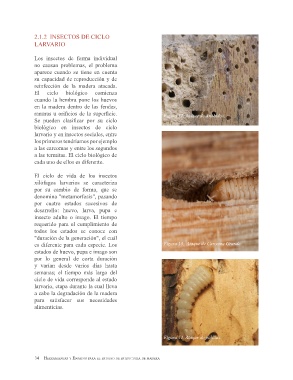 desarrollo: huevo, larva, pupa e especies que se alimentan de siguen la dirección de la fibra, El serrín que producen es muy