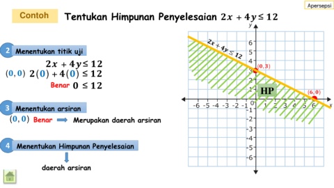 Apersepsi Contoh Tentukan Himpunan Penyelesaian + ≤ 2 Menentukan titik uji + ≤ ( , ) ( , ) ( ) + ( ) ≤ Benar ≤ HP ( , ) 3 Menentukan arsiran ( , ) Benar Merupakan daerah arsiran 4 Menentukan Himpunan Penyelesaian daerah arsiran