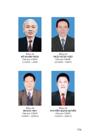 Đồng chí Đồng chí ĐỖ DANH THÂN TRẦN XUÂN VIỆT Chủ tịch UBND Chủ tịch UBND (11/2001 - 2005) (01/2006 - 7/2007) Đồng chí Đồng chí HOÀNG SEN NGUYỄN MẠNH QUYỀN Chủ tịch UBND Chủ tịch UBND (3/2008 - 12/2014) (12/2014 - 6/2017) 776