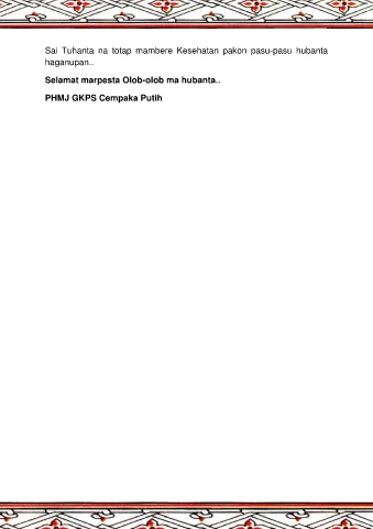Sai Tuhanta na totap mambere Kesehatan pakon pasu-pasu hubanta haganupan.. Selamat marpesta Olob-olob ma hubanta.. PHMJ GKPS Cempaka Putih