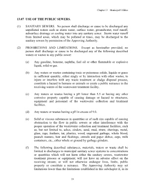 (1) SANITARY SEWERS. No person shall discharge or cause to be discharged any