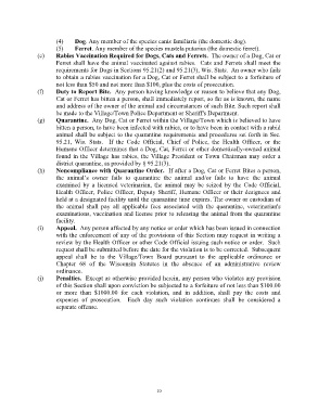 (g) Quarantine. Any Dog, Cat or Ferret within the Village/Town which is believed to have
