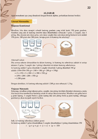 Isi kantong adalah 3 gelas ditambah 2 cangkir ditambah 1 piring ditambah 350 gr