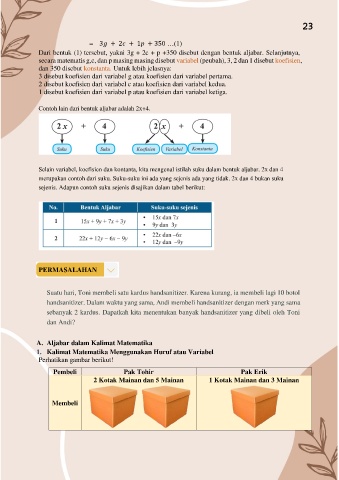 Dari bentuk (1) tersebut, yakni 3g + 2c + p +350 disebut dengan bentuk aljabar. Selanjutnya,