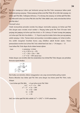 sisi kebun apel Pak Idris bisa ditulis x − 15. Seperti yang kita ketahui bahwa luas persegi panjang