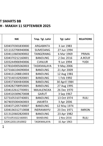 MANIFEST SMARTS BB KEBERNGAKATAN MADINAH - MAKAH 11 SEPTEMBER 2025 NIK SEX 3204370301830000 M 3211132706940006 M 3204110603690002 M 3204370212160001 M 3203244906940006 F 3278104905060003 F 3273166104090004 F 3204131208810003 M 3273140102920001 M 3204373004840006 M 320428270