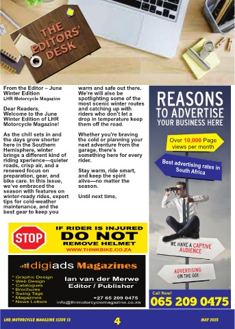 * News Letters info@lhrmotorcyclemagazine.co.za 065 209 0475