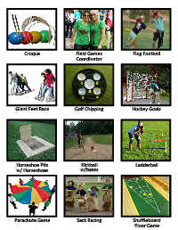 Croque Field Games Flag Football Coordinator Giant Feet Race Golf Chipping Hockey Goals Horseshoe Pits Kickball Ladderball w/ Horseshoes w/bases Parachute Game Sack Racing Shuffleboard Floor Game