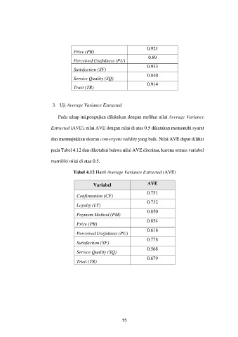 pada Tabel 4.12 dan diketahui bahwa nilai AVE diterima, karena semua variabel