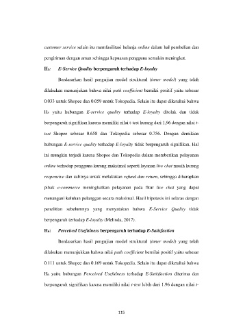 H5 yaitu hubungan E-service quality terhadap E-loyalty ditolak dan tidak
