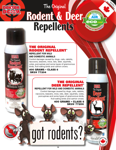 DEER REPELLENTTM REPELLENT FOR WILD AND DOMESTIC ANIMALS Control damage caused by dogs, cats, rabbits, raccoons, beavers, mice, rats, deer, squirrels, voles, porcupines and some types of granivorous birds, fruit-eating birds and carrion crows.