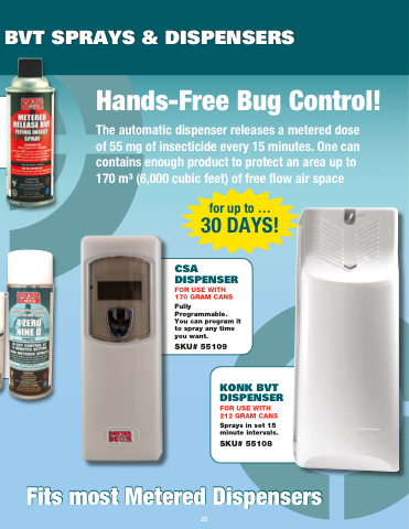 The automatic dispenser releases a metered dose of 55 mg of insecticide every 15 minutes. One can contains enough product to protect an area up to 170 m3 (6,000 cubic feet) of free ow air space
