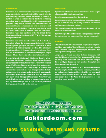 The active ingredient in Doktor Doom Jungle Juice is a great- smelling, long-lasting Tick & Mosquito repellent. Icaridin (also known as Picaridin) was developed many years ago and is just now being sold in Canada.
