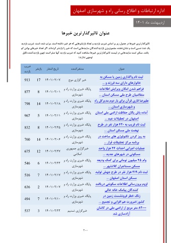 تاثیرگذارترین خبرها در جدول زیر بر اساس ضریب بازدید و تعداد بازنشرهایی که هر خبر داشته است ،مرتب شده است .ضریب بازدید