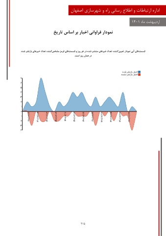 قسمتهای آبی نمودار تعیینکننده تعداد خبرهای منتشر شده در هر روز و قسمتهای قرمز مشخصکننده تعداد خبرهای بازنشر شده
