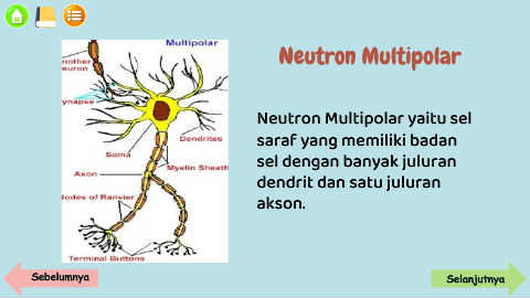 Neutron Multipolar Neutron Multipolar yaitu sel saraf yang memiliki badan sel dengan banyak juluran dendrit dan satu juluran akson. Sebelumnya Selanjutnya