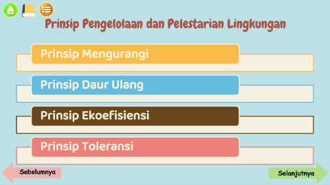 Prinsip Pengelolaan dan Pelestarian Lingkungan Prinsip Mengurangi Prinsip Daur Ulang Prinsip Ekoefisiensi Prinsip Toleransi Sebelumnya Selanjutnya