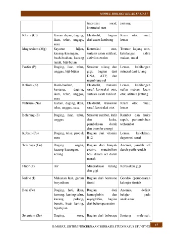 Klorin (Cl) Garam dapur, daging, Elektrolit, bagian Kram otot, mual,