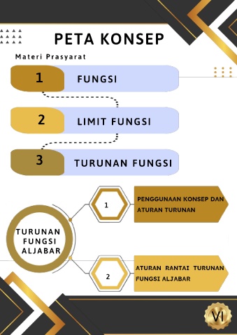 PETA KONSEP M a t e r i P r a s y a r a t 1 FUNGSI 2 LIMIT FUNGSI 3 TURUNAN FUNGSI PENGGUNAAN KONSEP DAN 1 ATURAN TURUNAN T UR UNAN F U NGS I AL JAB AR ATURAN RANTAI TURUNAN 2 FUNGSI ALJABAR VI