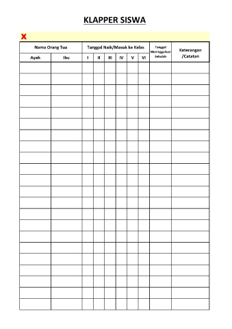KLAPPER SISWA X Nama Orang Tua Tanggal Naik/Masuk ke Kelas Tanggal Meninggalkan Keterangan Ayah Ibu I II III IV V VI Sekolah /Catatan