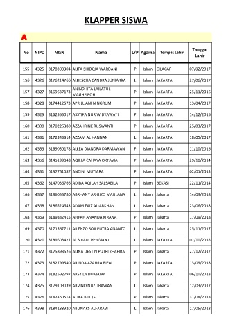 172 4373 3182799540 ARINDA AZAHRA RIFAI P Islam JAKARTA 13/09/2018
