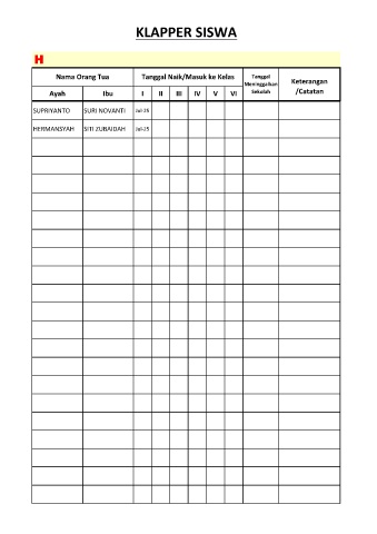 KLAPPER SISWA H Nama Orang Tua Tanggal Naik/Masuk ke Kelas Tanggal Meninggalkan Keterangan Ayah Ibu I II III IV V VI Sekolah /Catatan SUPRIYANTO SURI NOVANTI Jul-25 HERMANSYAH SITI ZUBAIDAH Jul-25
