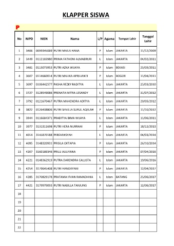 No NIPD NISN Nama L/P Agama Tempat Lahir