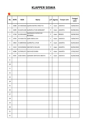 No NIPD NISN Nama L/P Agama Tempat Lahir