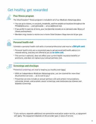 • Members may choose to receive one in-home SilverSneakers Steps exercise kit per year. Personal health visit