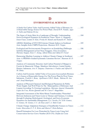 1st Int. Transborder Conf. of the Timor Island: Timor %u2013 Science without borderDili, 7-8 May 2025102DENVIRONMENTAL SCIENCESA Study On Carbon Value And Economic Added Value of Biomass As A Renewable Energy Source For Power Plant. David B.W. Pandie, Agus A. Nalle and Halena M.Asa%u2026..103 The Sense of Atoin Meto In a Landscape of Drought: Understanding Socio-Ecological Dynamics In Southwest Timor. Mario A. Onggang, Isnan Fauzi, Lommi D. Kini, Priska M. Manek and Kamello H. Daniel.%u2026..104 ARIMA Modeling of ETCCDI Extreme Climate Indices in Southeast Asia: Insights from CMIP6 Projections. Shannon M.D. Viegas.%u2026..105 Ecological and Socioeconomic Perspectives on Sonokeling (Dalbergia latifolia) Management in East Nusa Tenggara. Elisa Iswandono, Hariany Siappa, Enos T. Arung, Alfred Dima and Alfian H. Feisal%u2026..106 Harnessing Machine Learning to Address Climate Change in Southeast Asia: A PRISMA-Guided Systematic Literature Review. Shannon M. D. Viegas.%u2026..107 Analysis of Community Structure And Carbon Potential of Mangrove Forests In Manuwolu Village, Mamboro Sub-district, Central Sumba District, Indonesia. Aris N. Senjata, Chaterina A. Paulus and Alfred O. M. Dima.%u2026..108 Carbon And Economic Added Value of Leucaena leucocephala Biomass As A Source of Renewable Energy For The Power Plant In West Timor, Indonesia. Fredrik L. Benu, Apolonaris S.B.O. Muda, Halena M. Asa and Jusuf Manilapai. %u2026..109 Analysis of Physical-Chemical And Biological Parameters In Public Water Supply And Well Water In The Municipalities of Bobonaro And Liqui%u00e7%u00e1 According To Existing Legislation. Mariano Amaral, Romualdo Lopes da Cruz, Rosito Quint%u00e3o and M. Clara F. Magalh%u00e3es.%u2026..110 Integrated Assessment of the Mota-Masin Transboundary Watershed Between Indonesia and Timor-Leste in Tilomar and Fatumea, Covalima through Evaluating Hydrological, Geological, and Socio-Economic Dynamics for Sustainable Management. E.A. Serr%u00e3o, D.C.B.B. Gomes, G. Gomes, M. Gomes, C.C. de Deus and C.A. Mali-Code%u2026..111 Climate Change Adaptation Strategies of Smallholder Farmers in TimorLeste. Marcolino E. F. E. Brito and Maria F. Rola-Rubzen%u2026..112 Runoff Estimation For Loes Watershed In Timor-Leste Using Soil Conservation Service-Curve Number (SCS-CN). Delfim da Costa%u2026..113