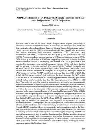 1st Int. Transborder Conf. of the Timor Island: Timor %u2013 Science without borderDili, 7-8 May 2025105ARIMA Modeling of ETCCDI Extreme Climate Indices in Southeast Asia: Insights from CMIP6 ProjectionsShannon M.D. ViegasUniversidade Cat%u00f3lica Timorense (UCT), Office of Research, Post-graduate & Cooperation, Dili, Timor-Leste, e-mail: shanviegas@gmail.comAbstractSoutheast Asia is one of the most climate change-exposed regions, particularly in relation to variations in extreme weather. In this study, we investigate past trends and future estimates of significant Expert Team on Climate Change Detection and Indices) climate extremes from the CMIP6 multi-model ensemble data. Specifically, we focus on four indices: maximum daily maximum temperature (TXX), maximum 1-day precipitation (RX1DAY), consecutive dry days (CDD), and consecutive wet days (CWD). Projection implies a uniform increase in TXX across the region by up to 2%u00b0C by 2050, with a general decline in RX1DAY, suggesting a potential reduction in shortduration extreme rainfalls. Concurrently, the number of CDDs is projected to rise considerably, particularly over central Indonesia, whereas CWDs will likely decline, with the greatest declines in mainland SEA, particularly in Thailand, Cambodia, and Vietnam. Overall, these trends suggest a higher risk of droughts and potentially a trend towards drier climatic conditions in some parts of the region. To investigate deeper the CWD trends, we built an ARIMA model from historical data from 1900 to 2014. The default ARIMA parameters (p=0, d=1, q=0) gave flat future forecasts for CWD, which is the reverse of the declining trend. Through hyperparameter tuning by grid search method, we had a better model (p=2, d=1, q=3) with an optimized lower RMSE of 1.956 days. This model portrayed the historical sequence more accurately but also maintained imperfections in terms of reproducing maximum values and abrupt nonlinear alterations. Seasonal decomposition of the time series pointed toward a diminishing trend for CWDs as well as the rise in the amplitude of the seasonal component, suggesting potential increased performance by the utilization of a Seasonal ARIMA approach. While ARIMA performed well in capturing short-term patterns and provided interpretable forecasts, its applicability to long-term forecasts is minimal. Model performance was much poorer than that in CMIP6 projections for SSP2-4.5 and SSP5-8.5 scenarios, particularly in not being able to simulate the amplitude and frequency of occurrence of extreme precipitation events. This highlights the ability of dynamical climate models to simulate intricate, nonlinear climate behavior under varying greenhouse gas emission scenarios. Overall, ARIMA modeling offers a low-complexity and pragmatic approach to the shortterm forecasting of extreme precipitation indices such as CWDs. However, its limitations in capturing nonlinear trends and long-term variability suggest integrating ARIMA with seasonal components or hybrid machine learning models. Higher-resolution temporal modeling (e.g., weekly) and ensemble-based approaches that combine statistical and dynamical modeling methods should be explored in future research. These advances will allow us to better forecast climate extremes and enable adaptive planning in climatevulnerable regions like Southeast Asia.